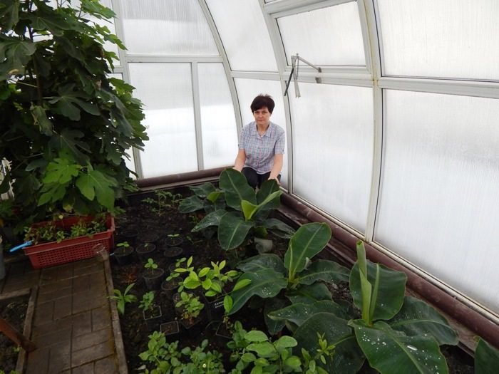 В 2015 году решили провести эксперимент по выращиванию экзотических фруктов. Коллеги из Киева подарили Елене несколько горшков с экзотическими саженцами среди них был банан сорта «Киевский карлик». Горшки сразу выставили во двор тепличного комплекса Богдановского лесничества. Растения дали неплохой прирост и отростки.